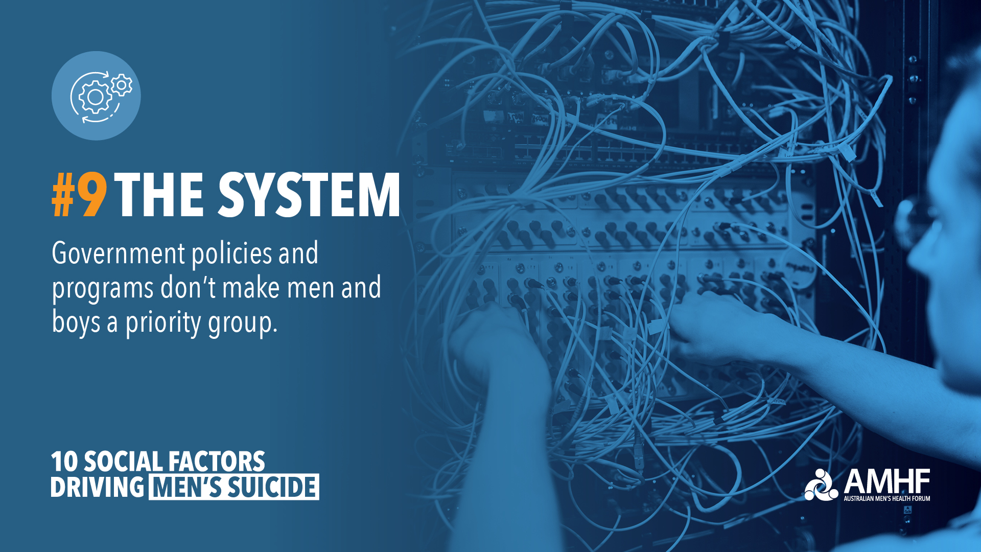 The problem of male suicide arises within a system of policy, funding, programs and services that overlook the health and social issues facing men and boys. Taking systemic action to address these issues is a key part of male suicide prevention.