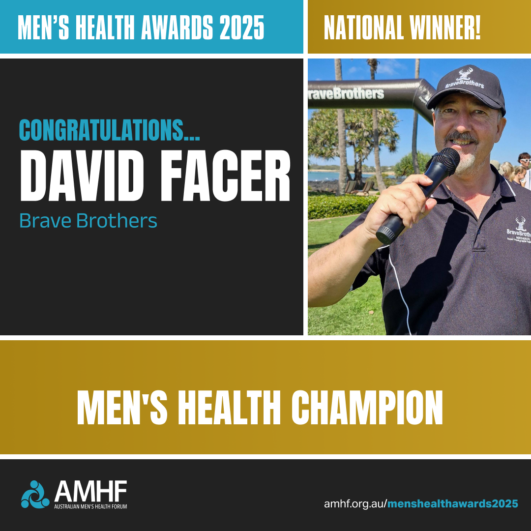 The National Men’s Health Champion 2025 was awarded to Queensland’s David Facer, founder of Brave Brothers, a grassroots movement built on connection, courage and conversation. Facer’s tireless advocacy and community engagement have helped countless men open up about their struggles and find strength through mateship.